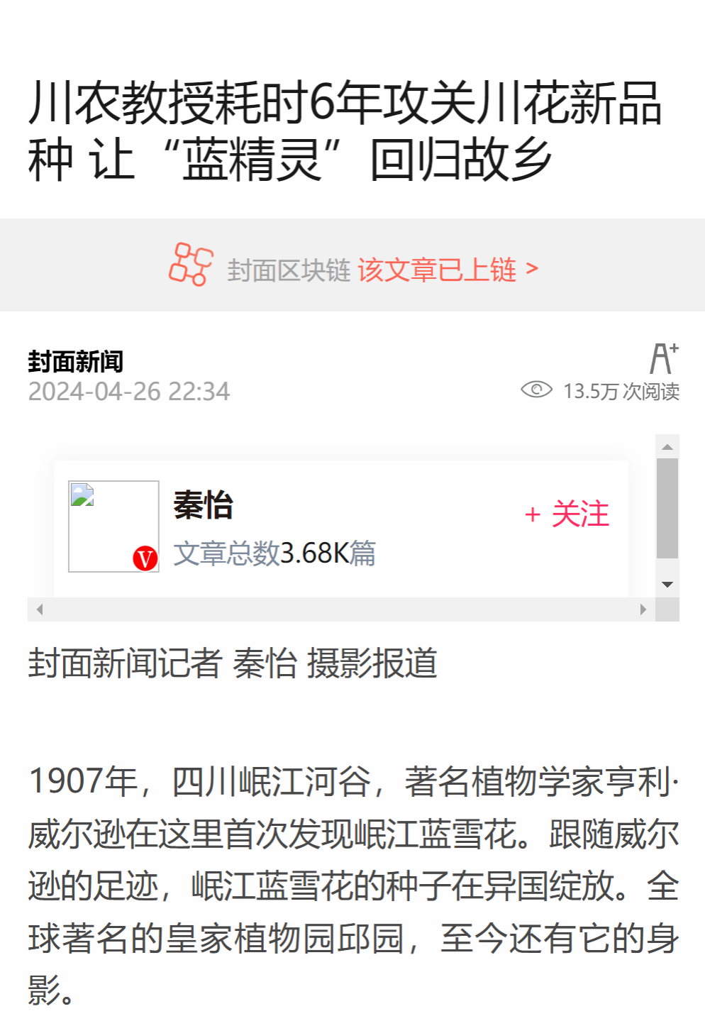 1907年,四川岷江河谷,著名植物学家亨利·威尔逊在这里首次发现岷江蓝雪花。跟随威尔逊的足迹,岷江蓝雪花的种子在异国绽放。全球著名的皇家植物园邱园,至今还有它的身影。