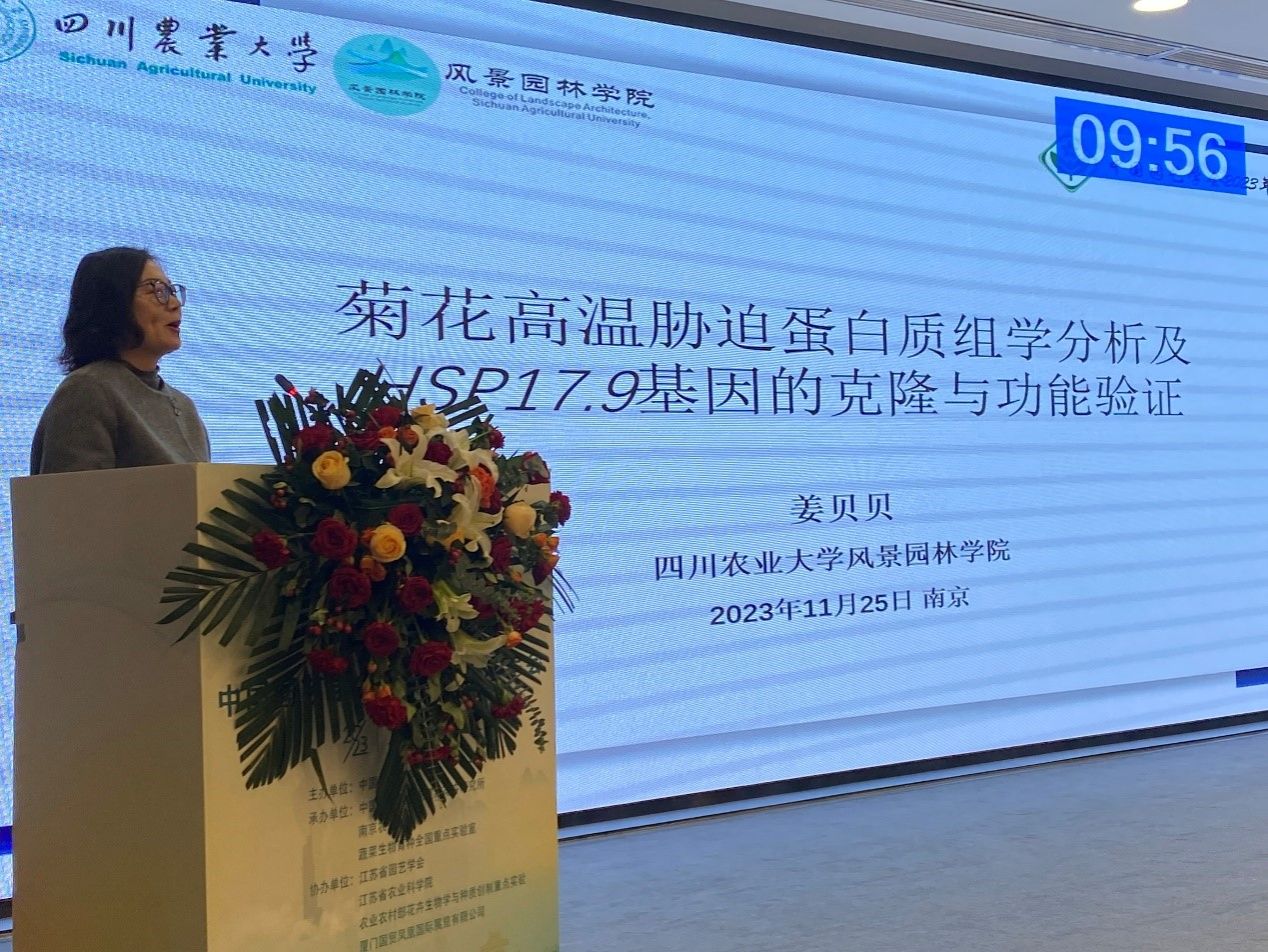 副院长姜贝贝教授率队参加会议,在观赏园艺分会场作了“菊花高温胁迫蛋白质组学分析及HSP17.9基因的克隆与功能验证”主题报告。