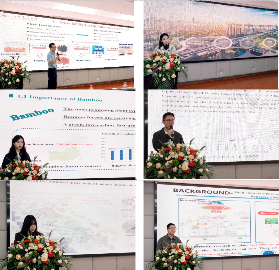 下午的学术报告由林学院副院长徐振锋教授和王丽霞副教授,以及草业科技学院院长黄琳凯教授和严海东特聘教授共同主持。美国加州大学戴维斯分校Xinhua He教授作了《ThePresence ofGrassesEnhances while14N-addition toReceiverPinesReduces15N Movement between Paired Pine Saplings in an Oak Woodland(橡树林中保留草增强了添加14N的接收松,而减少了与成对松树之间的15N移动)》的线下主旨报告,同济大学Mohamed Elsadek助理教授作了《The Healing Power of Nature: Unveiling the Therapeutic Potential of Urban Landscapes in Cities(大自然的治愈力量:揭示城市中城市景观的治疗潜力)》的线下主旨报告,布尔诺孟德尔大学Douglas Godbold教授作了《The Benefits of Tree and Mycorrhizal Diversity for Ecosystem Stability and Services(树木和菌根多样性对生态系统稳定性和服务的益处)》的线上主旨报告,西班牙植物分子与细胞生物学研究所Aureliano Bombarely教授作了《Application of the AI to the Genome Annotation in Plants(人工智能在植物基因组注释中的应用)》的线上主旨报告。此外,环境学院田东副教授作了《Fractionation of Lignocellulosic Biomass Waste and Application of its Three Fractions(木质纤维素生物质废物的分馏及其三种馏分的应用)》的青年报告;研究生李宗晟、叶呈文、靳雅荣分别作了《Research on the Impact Mechanism of Landscape Pattern Evolution of Urban Ecological Land on Carbon Sequestration(城市生态用地景观格局演变对碳汇的影响机制研究)》、《Child-friendly Park Design in Xiong'an New Area Guided by Natural Development(雄安新区以自然发展为导向的儿童友好型公园设计)》和《Analysis of the Heat Stress Mechanism based on the Pan-genome in Pearl Millet(基于珍珠栗泛基因组的热应激机制分析)》的青年报告。