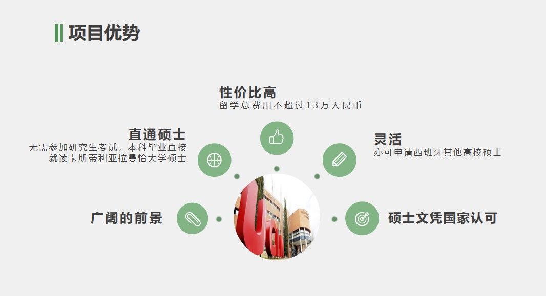 2.无需研究生考试,可选择直升卡斯修读硕士或申请其他西班牙名校,便捷灵活.西班牙联合培养项目施行后,中西大学学历互认,风景园林专业采取4+1+1的培养模式,园林、环境设计专业采取3+1+1的培养模式,在国内修完4年/3年课程后,在西班牙卡斯蒂利亚拉曼恰大学修读本科最后一年的课程,即可取得川农的学士学位,接下来无需研究生入学考试,通过申请即可进入中国教育部认可的西班牙名校学习,硕士文凭在中国也得到官方认可。