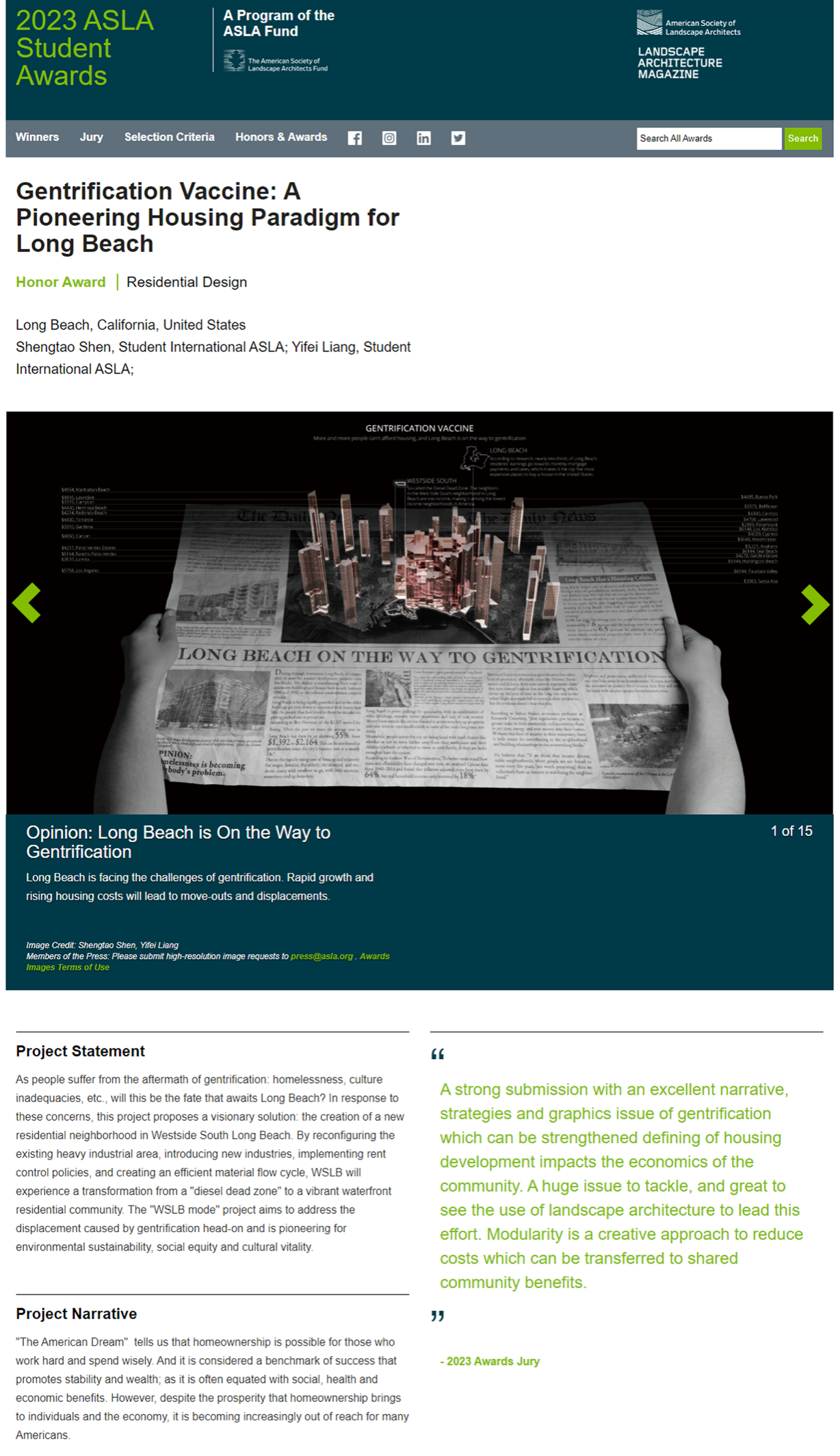 沈圣涛和四川大学在读本科生梁逸飞,在我校包子漫画 青年教师吕兵洋指导下,创作的作品“Gentrification Vaccine: A Pioneering Housing Paradigm for Long Beach”(士绅化疫苗:长滩的先锋住宅范例),通过将一个重工业污染区逐步转变为富有活力的滨水住宅区的创作设计,旨在降低房屋建设与设计成本,解决低收入群体住房困难甚至流离失所的问题。作品开创新的设计获得了评委的一致认可,评审团对此作品评价道:“一份强有力的提案,包括出色的叙述、策略和图像,可以加强对住房开发的定义,从而影响社区的经济。这是一个需要解决的巨大问题,很高兴看到景观设计学来领导这项工作。模块化是一种降低成本的创造性方法,可以转化为共享的社区利益。”最终,沈圣涛的作品从众多参赛作品脱颖而出,获得学生组“住宅设计类”荣誉奖,这也是该类别(住宅设计类)有史以来,第一次由中国国内学生团队获奖,同时也打破了近十年,该奖项则完全由哈佛大学和宾夕法尼亚大学学生“轮流坐庄”的局面。这也是继2016年,包子漫画 研究生余普、罗蓝获得ASLA学生组分析与规划类荣誉奖后,我校学子再次获得这项景观设计界的最高奖项。