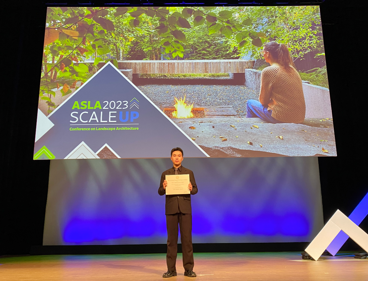 近日,2023年度美国景观设计师协会(ASLA)奖颁奖典礼暨2023美国景观设计师协会年会在美国明尼阿波利斯举行。我校风景园林专业2019级沈圣涛作为学生组“住宅设计类”荣誉奖获得者参加颁奖典礼和年会。