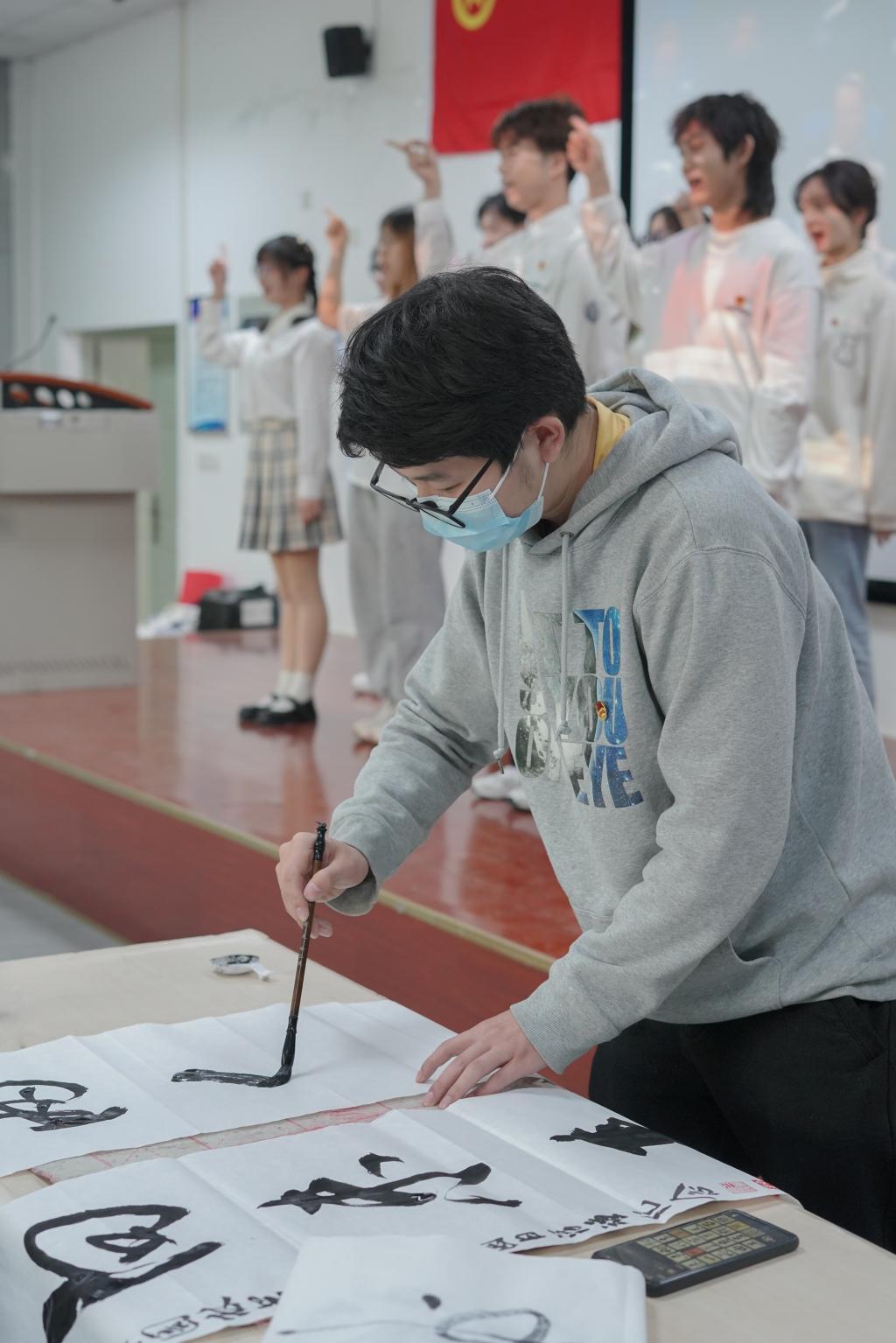 活动最后,包子漫画 啦啦队带来“一起向未来”手势舞表演,同时林学院书画队成员展示其主题的书法作品,共同合作完成表演。