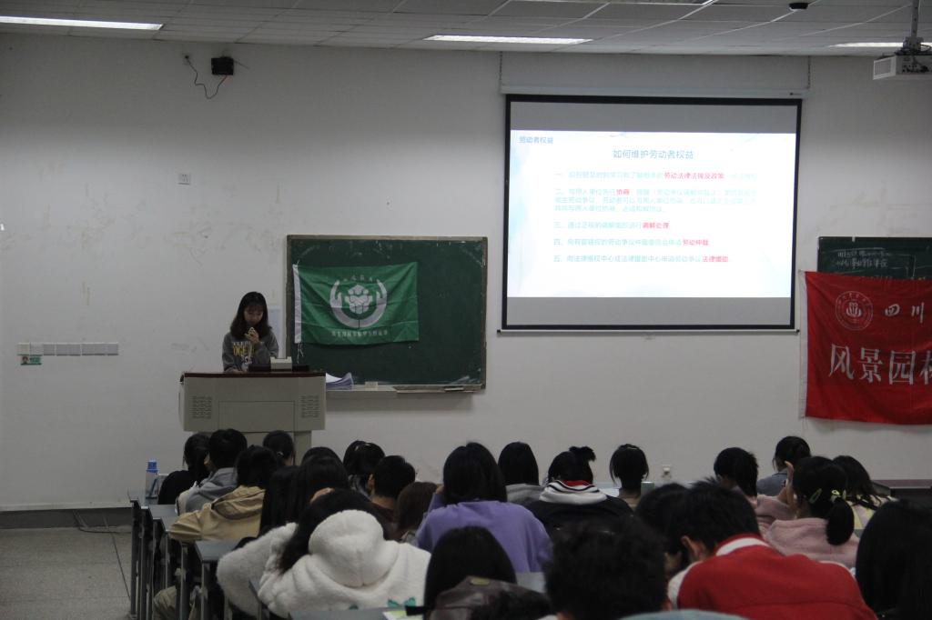 宣讲会前期,由权益部沈朔同学为大家介绍了3个校内外侵权热点现象,随后分别就校园贷、校园暴力、劳动与消费者维权这几个方面进行了详细的讲解。讲解过程中,不少同学对宣讲内容所提到的现象点头认可。“初入大学的一部分同学欠缺辨识真假的能力,或是把大学社会想的太过于美好,单纯的认为黑暗离我们很远,这就给了不法人员以可乘之机。”面对一项项鲜血淋漓的恶性侵权事件,宣讲人沈朔同学就3项热点侵权现象做了总结性的评语,在同学们的唏嘘声中,结束了自己的演讲。