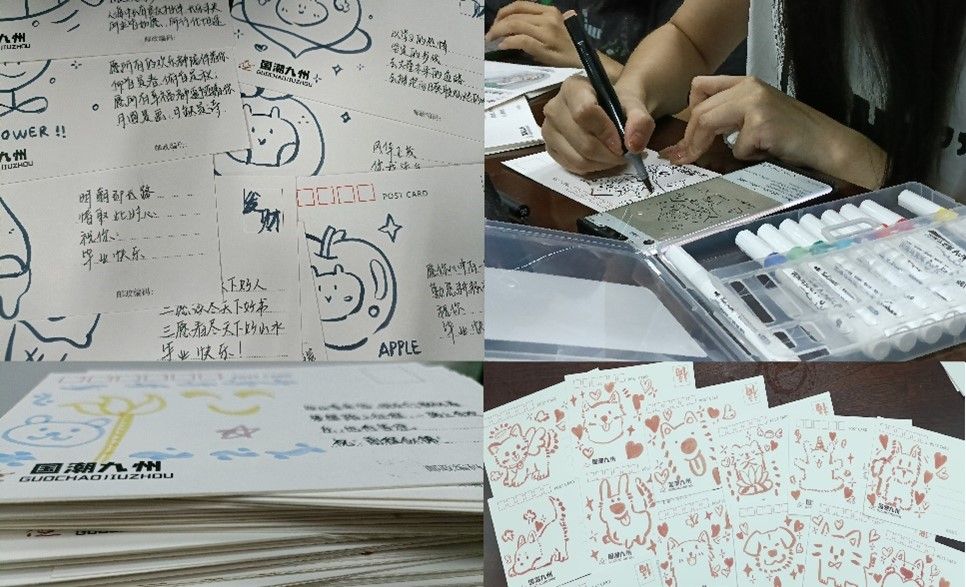 “愿你从此刻启程新途,心有所期,全力以赴,前程似锦,未来可期!” “亲爱的同学,是你们带我感受青春、体味激情、憧憬梦想、书写岁月,毕业之际,致敬可爱的所有的你们。记得常回母校!”“师兄师姐,我们不说再见,只期还有遇见!”“有一种相聚叫离别,有一种离别是更好的相聚,祝师兄师姐毕业快乐!”打开盲盒首先映入眼帘的是毕业生的师弟师妹、班主任、辅导员老师亲手绘制的祝福贺卡。每份不一样的贺卡随机地装入礼盒之中,毕业生们打开之际才能收到这份“11的意外”,甚至有可能就是自己班主任、辅导员、或“亲师弟师妹”的亲笔祝福。虽然纸短情长,一些画,一些话,但也充满着老师和同学对毕业生们的祝福、期许与不舍,也寓意着踏出校门之后不管身处何地,母校永远都是他们的家。