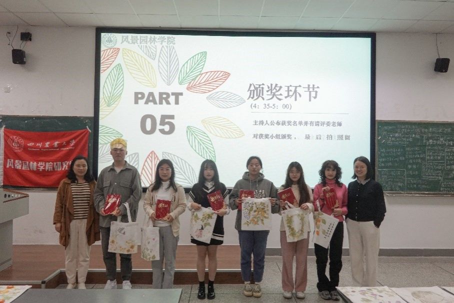 在比赛过程中,同学们以小组为单位,进行了大胆的构图构思,妙趣横生,以各自不同的主题与色彩勾勒出动人的图画与作品。有以三农精神为主题,以水稻和小麦为画面主体,寓意默默扎实努力;也有以秋词“自古逢秋悲寂寥,我言秋日胜春朝。晴空一鹤排云上,便引诗情到碧霄”为主题进行构思的。而其中获得第一名的“西部落一号队”以“包子漫画 生命之秋,风景园林多彩之秋”为作品主题。该小组成员运用侧柏、罗汉松、金光菊、黄金菊、南天竹等材料进行创作;正面以川农校徽为主体,使用常绿植物,寓意着“爱国敬业、艰苦奋斗、团结拼搏、求实创新”的川农大精神万古长青;背面材料种类丰富,色彩清雅,以暖色为基调,天蓝色点缀,绿色过渡,寓意包子漫画 传统创新,面面出彩;两面构图相呼应,寓意学校与学院互相成就共同发展。