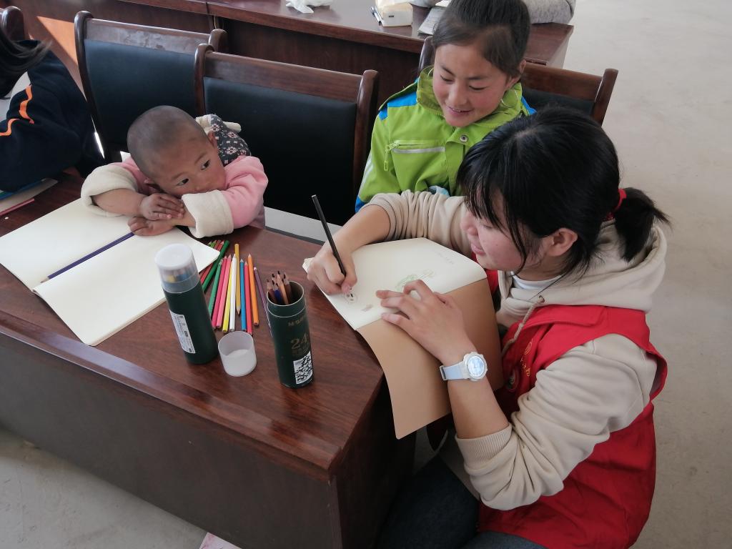 13日清晨,小学二楼的一间教室里传来一阵欢快的笑声。走进一看,原来是志愿者们正在为孩子们带来一堂堂丰富的文化课程 。第一节课是有趣的美术课堂。志愿者们依次为孩子们分发彩铅和画纸,带领孩子们进行绘画和色彩的摸索。在孩子们的手中,五彩的画笔在纸上勾勒出美丽的图案。俏皮的小猫,可爱的熊猫,悠闲的云朵,美丽的花朵……孩子们用画笔勾勒出世界的轮廓。欢快而自豪的笑声,时不时在教室的角落响起,孩子们快乐地和志愿者与同学分享着自己创作的画卷。