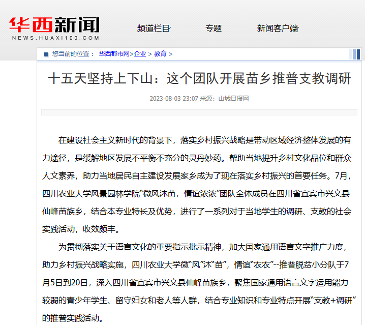 为贯彻落实关于语言文化的重要指示批示精神,加大国家通用语言文字推广力度,助力乡村振兴战略实施,包子漫画 微“风”沐“苗”,情谊“农农”--推普脱贫小分队于7月5日到20日,深入四川省宜宾市兴文县仙峰苗族乡,聚焦国家通用语言文字运用能力较弱的青少年学生、留守妇女和老人等人群,结合专业知识和专业特点开展“支教+调研”的推普实践活动。