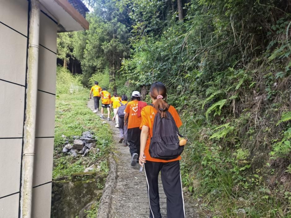 图为团队志愿者们排队上山支教途中