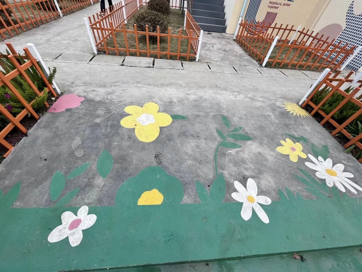 在调研过程中,团队成员注意到社区中一处景观:纯白色的墙面上绘制了五彩斑斓的图案,翠绿色的草坪上飞满了蝴蝶,就连台阶上也都画上了五颜六色的花。“每次放学我都会叫上我的好朋友们一起在这里玩游戏,我喜欢这里!”社区内的居民小朋友激动地向成员们说道。