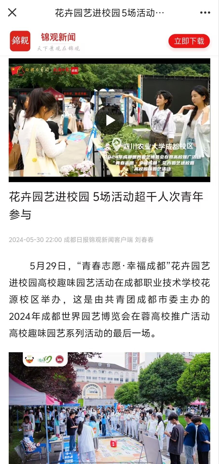 5月29日,“青春志愿·幸福成都”花卉园艺进校园高校趣味园艺活动在成都职业技术学校花源校区举办,这是由共青团成都市委主办的2024年成都世界园艺博览会在蓉高校推广活动高校趣味园艺系列活动的最后一场。