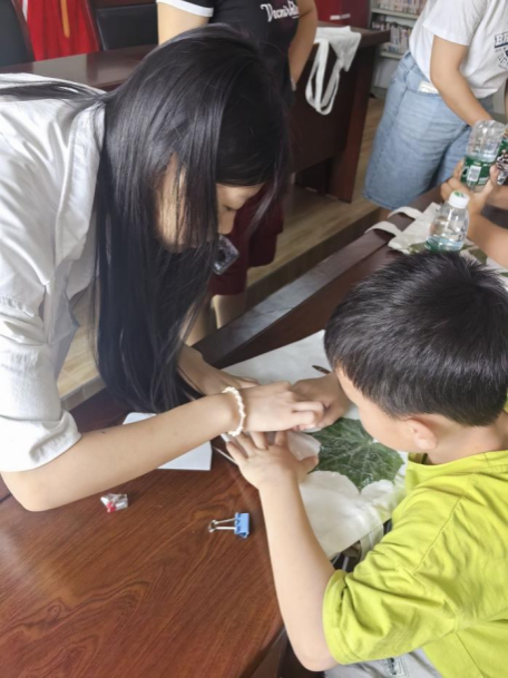 抵达铁牛村后,团队成员首先前往村委会,为当地儿童带来了一场别开生面的垃圾分类知识讲座。通过生动有趣的讲解与互动,孩子们不仅了解了垃圾分类的基本概念与方法,还积极参与讨论,提出了许多富有创意的问题。随后,团队成员引导孩子们进行了拓染手工制作,利用当地自然资源,亲手制作独一无二的拓染布包,让孩子们在体验中感受大自然的魅力,激发他们对自然探索的兴趣与热情。
