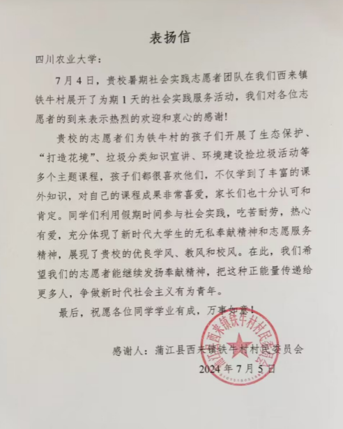 本次社会实践活动也得到了铁牛村党委的肯定和表扬。大学生社会实践是服务人民、奉献社会的重要途径。团队成员们的实践行动,正是这一精神的生动体现。团队成员们用自己的实际行动,为乡村发展注入了新的活力和希望,同时也让社会看到了新时代川农学子的责任和担当。