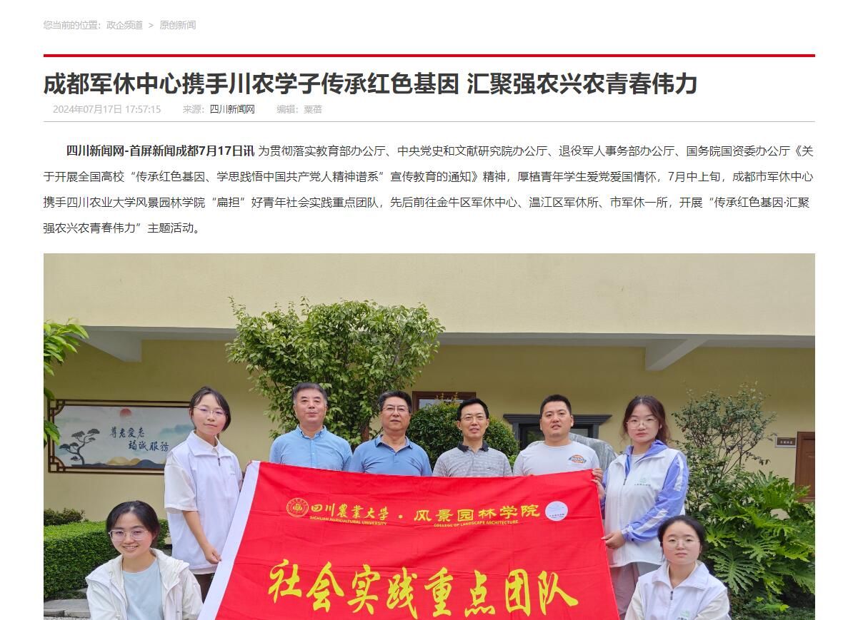 7月17日讯为贯彻落实教育部办公厅、中央党史和文献研究院办公厅、退役军人事务部办公厅、国务院国资委办公厅《关于开展全国高校“传承红色基因、学思践悟中国共产党人精神谱系”宣传教育的通知》精神,厚植青年学生爱党爱国情怀,7月中上旬,成都市军休中心携手包子漫画 “扁担”好青年社会实践重点团队,先后前往金牛区军休中心、温江区军休所、市军休一所,开展“传承红色基因·汇聚强农兴农青春伟力”主题活动。