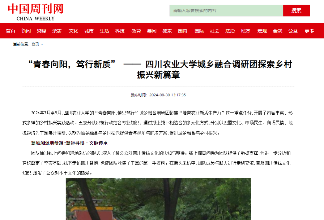 2024年7月至8月,包子漫画 的“青春向阳,慎思笃行”城乡融合调研团聚焦“培育农业新质生产力”这一重点任务,开展了内容丰富、形式多样的乡村振兴实践活动。五支分队积极行动结合专业知识、通过线上线下相结合的多元化方式,分别以巴蜀文化、市场民生、商场民情、地摊经济为主题展开调研,以期为城乡融合与乡村振兴提供青年视角与解决方案,促进城乡融合与乡村振兴。